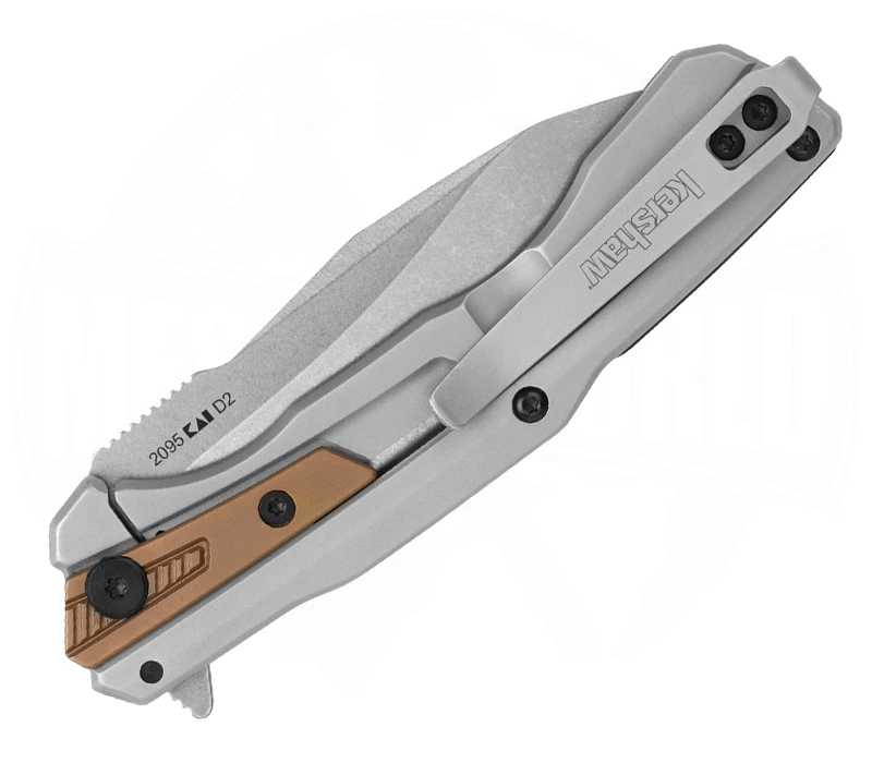 Das Endgame ist ein besonderes Taschenmesser, das mit seinen modernen Materialien und ungewöhnlichen Design so manche Blicke auf sich zieht. Die 8,3 cm lange D2-Klinge in Drop-Point Form eignet sich für viele Alltagsaufgaben. Das Stonewash-Finish gibt dem Messer einen leicht rustikalen Akzent und lässt Kratzer weniger stark auffallen. Der Flipper lässt die kugelgelagerte Klinge butterweich aufspringen, wofür nur eine Hand nötig ist. In der Arbeitsposition hindert ein stabiler Framelock die Klinge am ungewolltem Einklappen. Der Griff besteht aus einer Kombination aus Edelstahl und glasfaserverstärktem Nylon. Die bronzefarbenen Akzente runden das auffallende Erscheinungsbild ab. Mit dem umsetzbaren Taschenclip kann man die Trageposition an den Träger anpassen, weshalb das Endgame auf gut für Linkshänder geeignet ist.